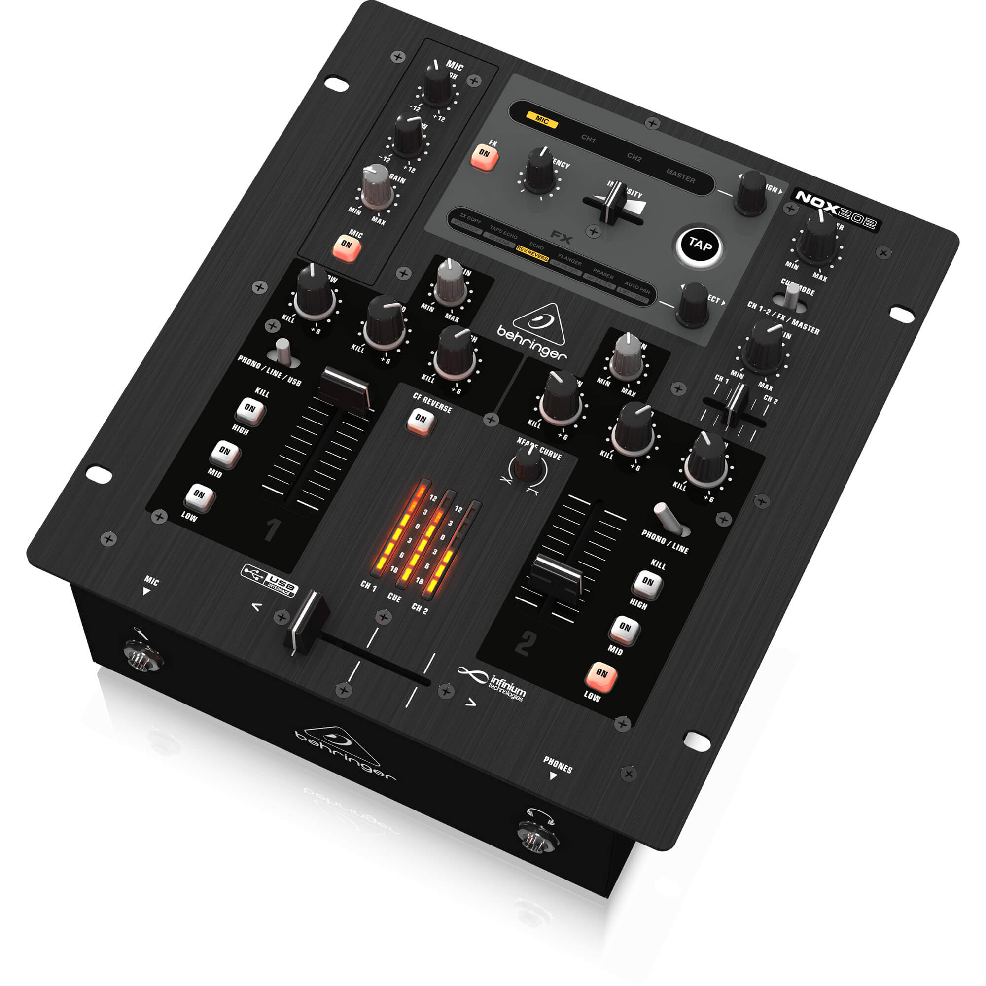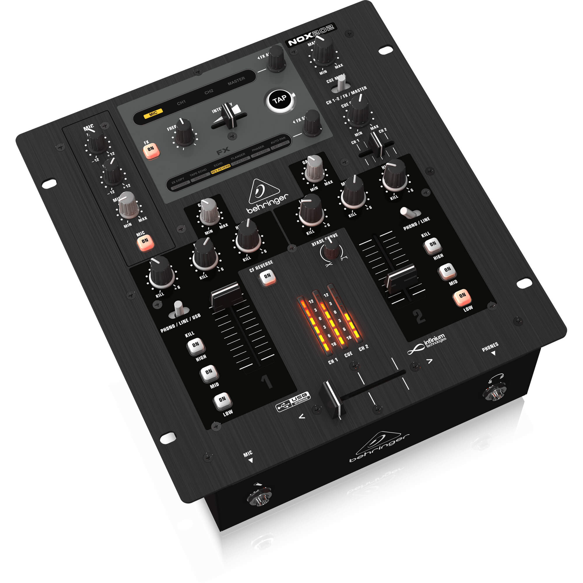 If the NOX202 had a middle name it would be “easy.” The NOX202’s intuitive layout makes it easy to operate right out of the box. Beneath its elegant exterior lies the heart of a 2-channel DJ battle mixer complete with a beat-syncable FX section, 3-band channel EQ and full-kill filters. Premium-grade phono preamps, along with our legendary XENYX mic preamps, ensure the ultimate in signal integrity and punch. And thanks to NOX202’s onboard USB audio interface you can add your MP3s to the mix with just the flick of a switch. The NOX202 is a veritable killer in its weight class!