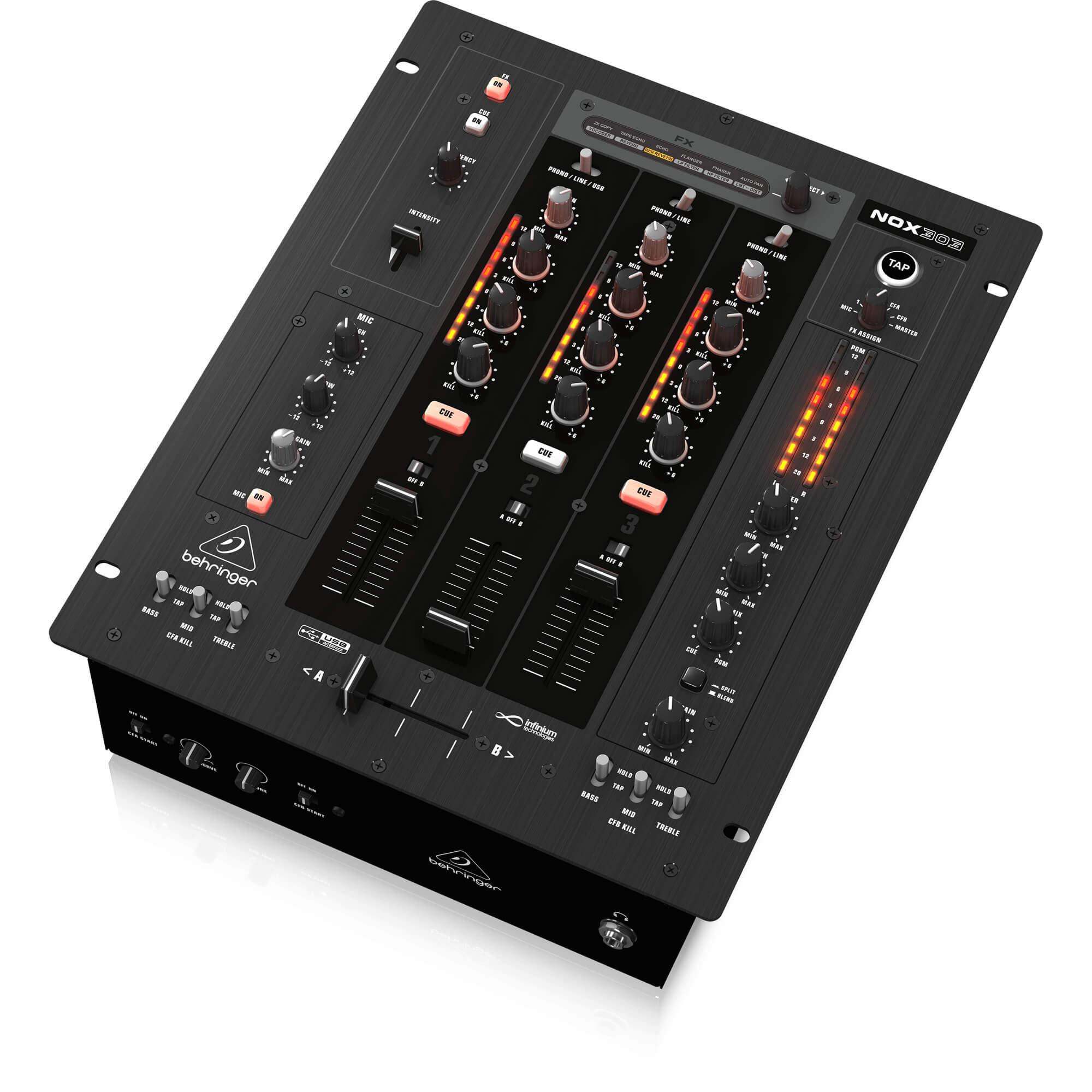 Armed with many of the same features as the NOX202, the NOX303 features an additional input channel and VCA-controlled faders with fader start, which allows you to seamlessly integrate auto-start capable CD players. You get our outstanding phono and XENYX mic preamps, renowned for their superior sonic integrity and wide dynamic range, along with built-in USB connectivity. State-of-the-art, beat-syncable FX processing and balanced XLR Master Outputs round out this mighty middleweight.