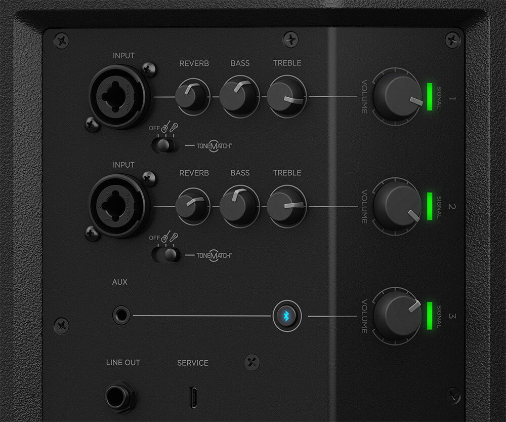 (S1 Pro systems are available for purchase with or without battery.) - Onboard 3-channel mixer offers independent ToneMatch®, reverb, and EQ controls on two channels, with a dedicated channel for either wired (3.5 mm) or wireless music sources.