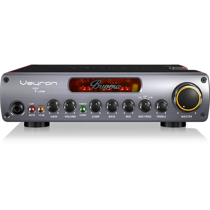 The BUGERA VEYRON TUBE satisfies your need for the utmost in unbridled horsepower. An ultra-compact and stylish bass amplifier, the impressive VEYRON TUBE packs an incredible 2,000 Watts of lightweight, Class-D power under the hood – with plenty of room left over for some amazing features. Inside you’ll find an expressively-dynamic optical compressor, a trio of 12AX7 tubes configured in a 6-stage Class-A preamp, as well as our DYNAMIZER technology that really packs a punch! Together with a versatile and wide-ranging EQ section, an integrated balanced DI, dedicated FX Loop and more, the VEYRON TUBE will see you through every level of your playing career – from the practice room to the stadium!