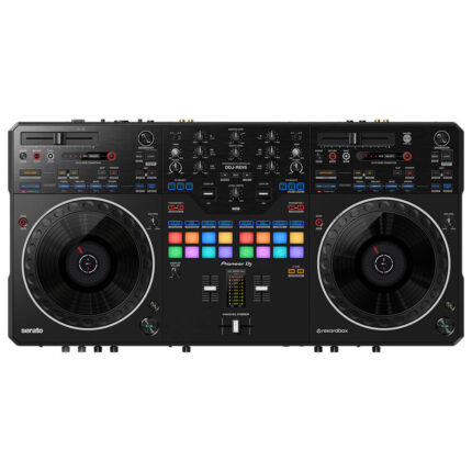 The DDJ-REV7 is solid and robust, yet still lightweight enough to grab by the handles on the chassis and carry to your next gig. Contrasting matte and hairline finishing in different sections of the aluminum top plate create distinction between the deck and mixer sections, so the layout looks like a traditional 2 x turntable + mixer setup, while the On Jog Displays mimic the label in the center of a vinyl record.
