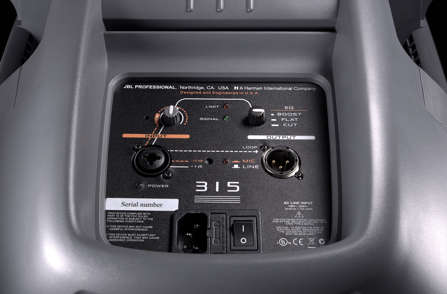 The EON315 is a 15-inch, two-way, powered, portable speaker system. It is a complete self contained sound reinforcement system, capable of full-bandwidth reproduction at high levels with the added benefit of a microphone pre-amp enabling the direct connection of a dynamic microphone. The EON315 is comprised of a 380 mm (15 in) JBL woofer, a 25.4 mm (1 in) neodymium high frequency compression driver coupled to a 100° H by 60° V waveguide. Both components are driven by the discrete channels of a 280 watt Class-D integrated power amplifier. The input section contains all cross-over functions, protection, and system EQ functionality.