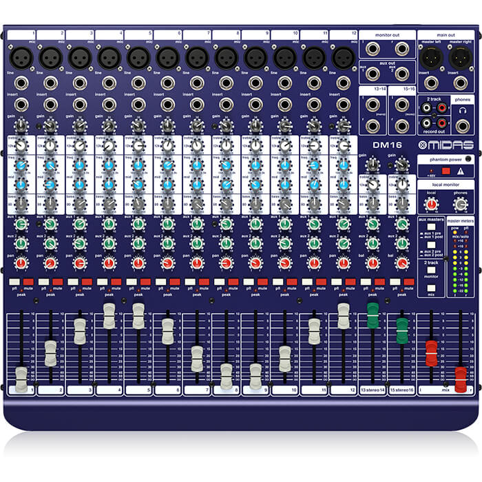 No matter what your audio mixing needs, the DM16 provides the performance and features required to take your talent to the next level, at a price that is custom-tailored for the budget-savvy user. Professional sound quality, our legendary Midas mic preamps, 3-band EQs with sweepable mids, and much more make the DM16 mixer ideal for both your live gigs and recording. Try one out today, or feel free to order yours online.