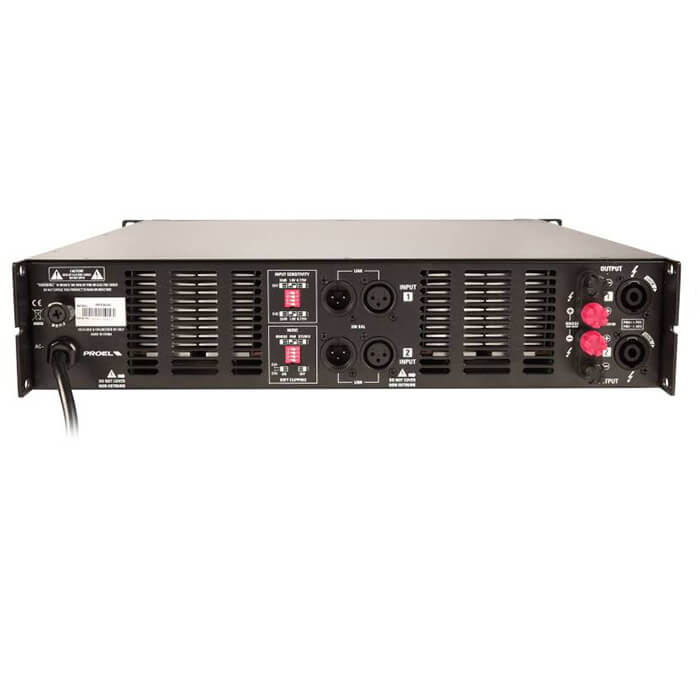 Stereo power amplifier 2 x 2300 W at 2 ohm with switchable CLIP limiter
