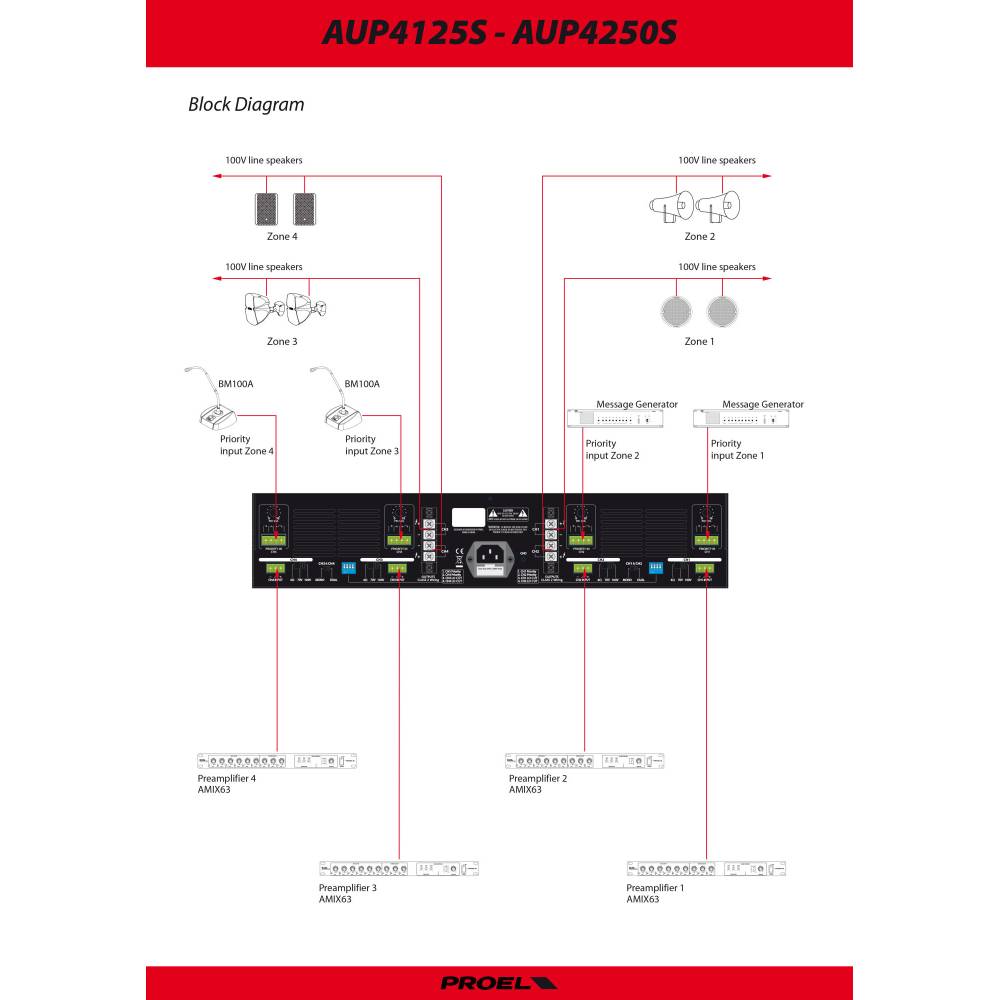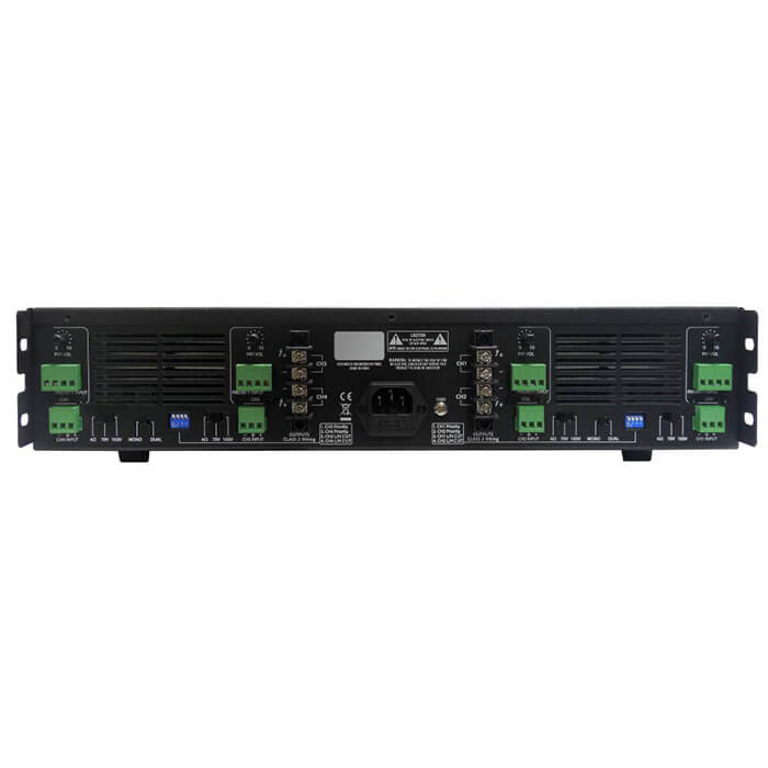 4 x 250W digital Power amplifier , 4 independent 70V/100V/8Ω/4Ω Outputs, 4 independent Balanced inputs with level control, dedicated Priority balanced input, Master control and independent Low/High Tone control for each channel, PA-HF filter each channel, SMPS (switch mode power supply), 2U Rack mount