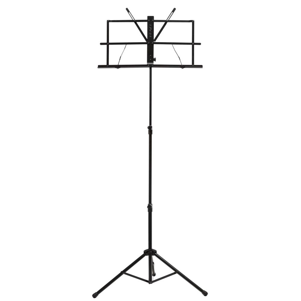 Music stand with 3-section adjustable height with tilting sheet music rest, steel structure and nylon sliding parts. Foldable, it can be easily stored and transported with the practical carrying bag included. Available in matt black finish.