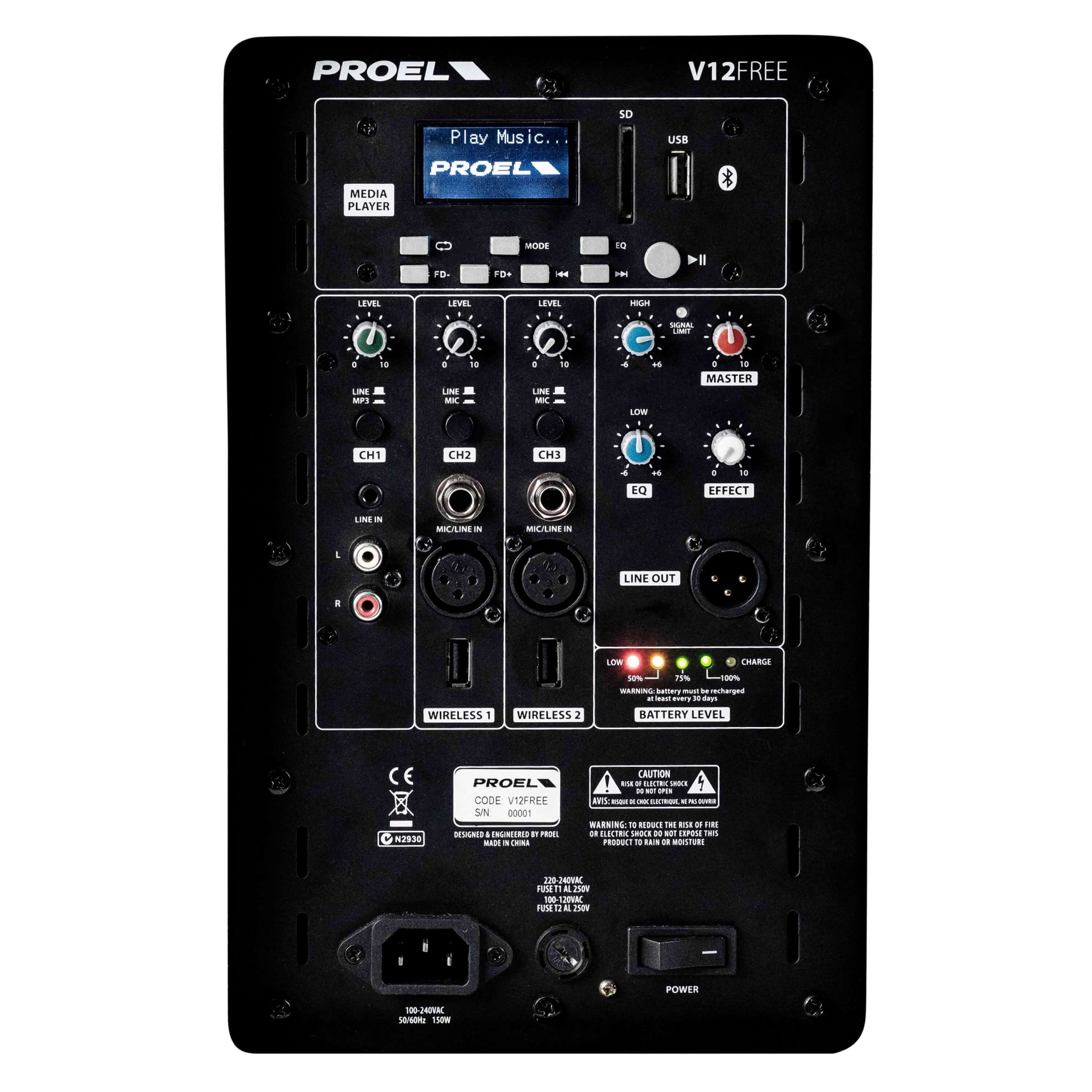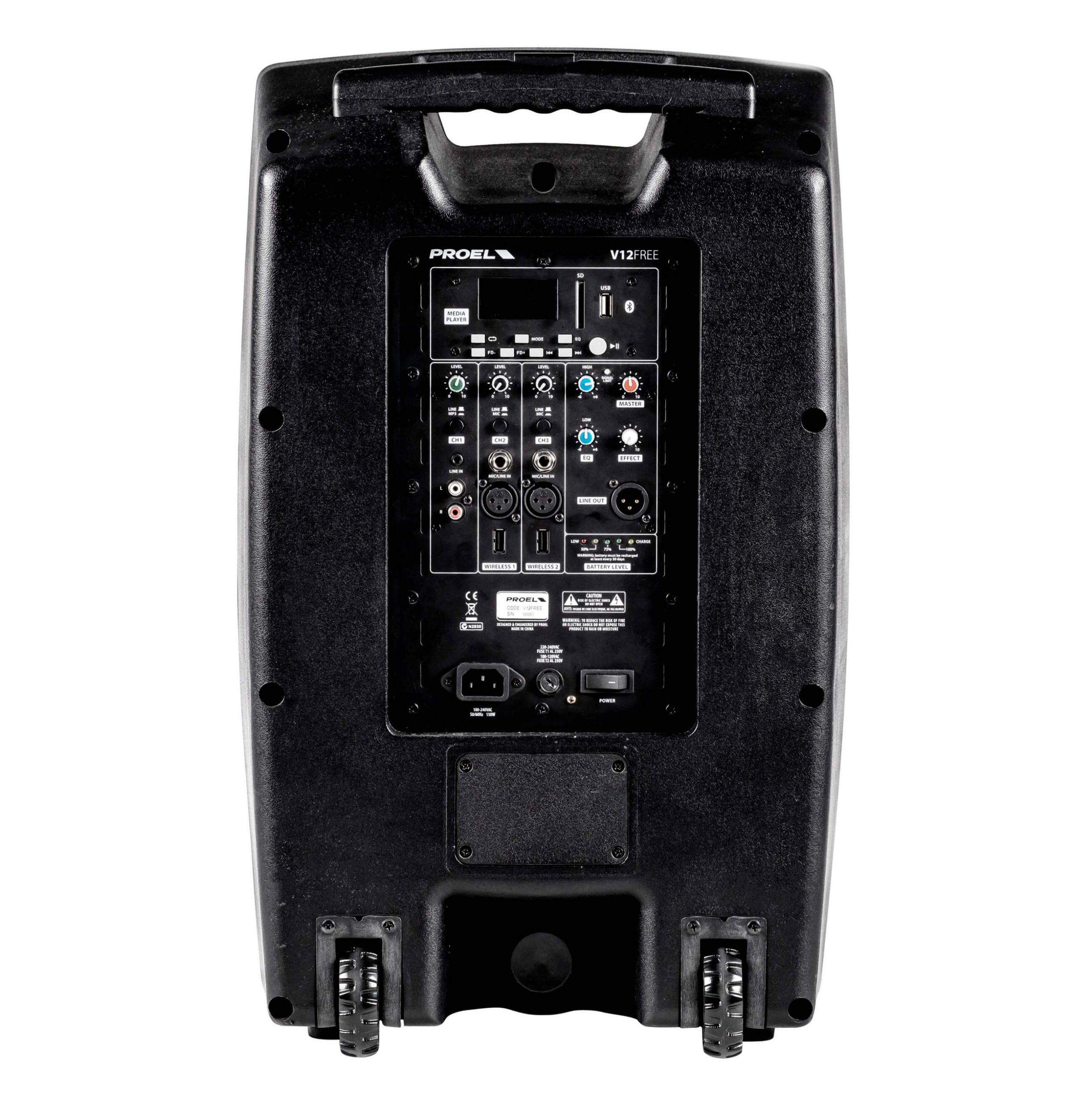 PROEL V FREE systems gives you the freedom to perform your music or play your sound anywhere, with a superb sound quality and without the hassle of laying down cables or finding a power outlet. V10FREE and V12FREE are battery-powered portable sound systems featuring a powerful 400W amplifier, a built-in 3-channel mixer with effect and tone controls and an advanced MP3 player with BLUETOOTH connectivity, featuring a large back-lit LCD display and able to play songs from SD card, USB MEMORY STICK or directly from your smartphone or tablet.