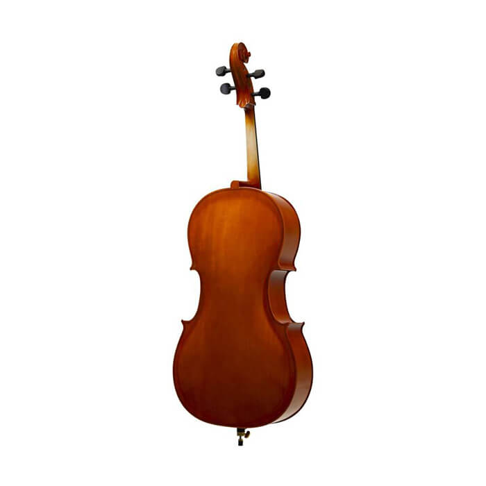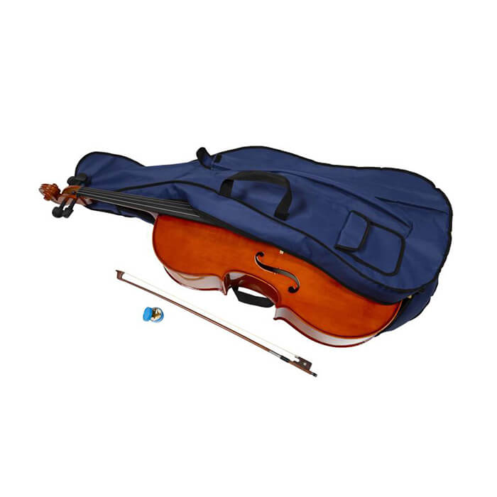 4/4 cello, solid spruce top, back and side, dyed hardwood fingerboard and pegs. Metal tailpiece with 4 finetuner. Blue bag, entry level plus bow, Rosin