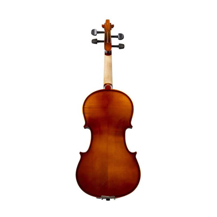 3/4 violin, spruce top, solid maple back and side, dyed hardwood fingerboard and pegs. Metal tailpiece with 4 finetuner. Blue foam case, entry level bow, Rosin