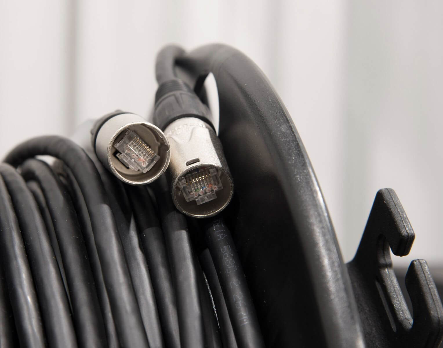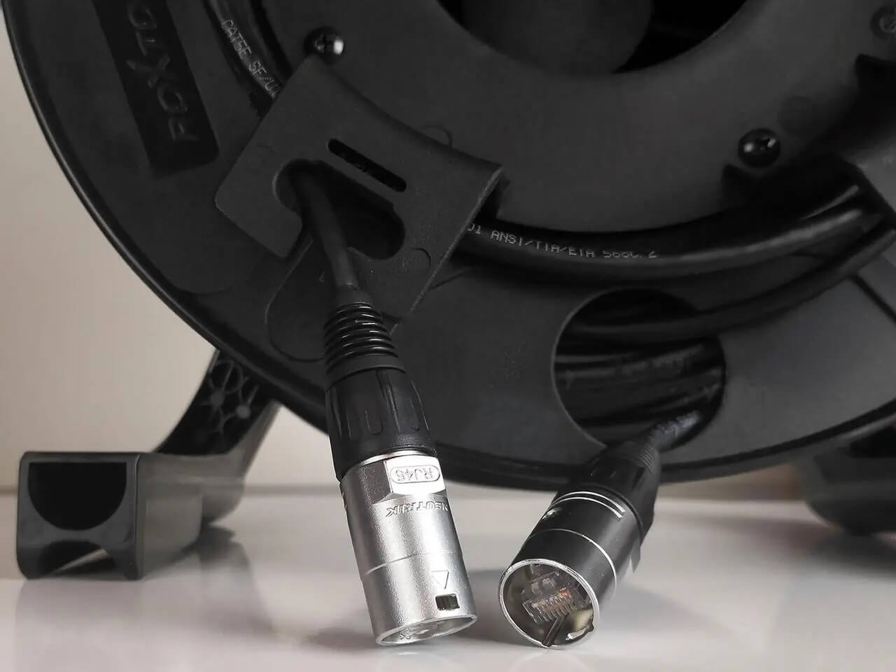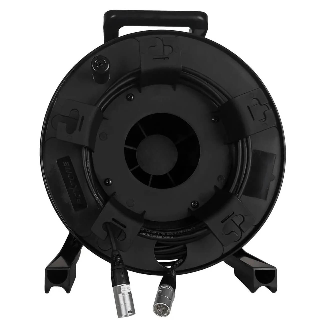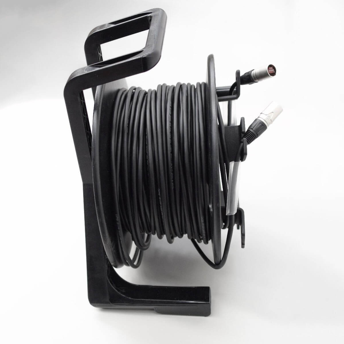 Cable reels are designed for use in touring conditions. Flexible network cable and rugged connector housings are ideal for harsh outdoor environments. The portable plastic reel is highly durable and lightweight.
